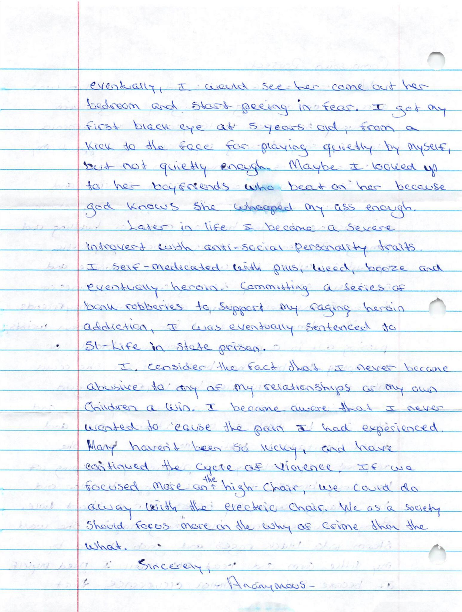 "If we focused more on the high chair, we could do away with the electric chair. We as a society should focus more on the why of crime than the what."